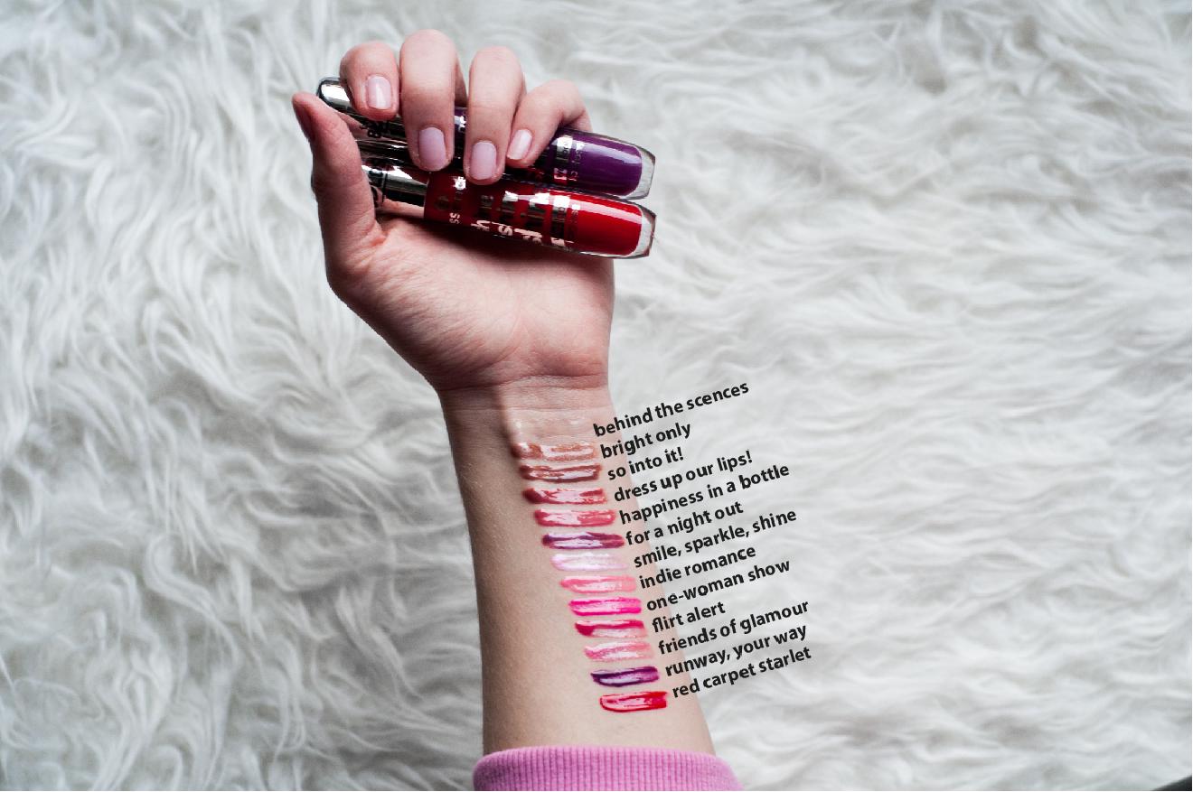 Heute zeige ich Euch eine kleine Vorschau der neuen shine shine shine Lipgloss-Serie von Essence in 13 verschiedenen Farben – darunter Nude-Nuancen, schimmerndes Pink und intensive Rottöne. Erhältlich ist die Serie ab jetzt in Drogeriemärkten wie DM, Rossmann, Müller etc. Bis zur Ära der matten Lippenstifte war mein liebstes Make-up Utensil der Lipgloss. Ich war ein richtiger Lipgloss-Junkie! Das ist etwa fünf Jahre her…mittlerweile gibt es auch matte Lipglosse auf dem Markt. Das Schöne dagegen an glänzendem Lipgloss ist der frische, natürliche Teint, dem er dem Träger zaubert. Darüber hinaus sorgt der Lipgloss durch Feuchtigkeits- und Pflegepigmente für geschmeidige, weiche Lippen. Jetzt zum Tragetest der Essence Lipgloss-Serie. Trotz günstigem Preis von 1,99 € überzeugt der Lipgloss durch einfaches Auftragen und angenehmes Tragegefühl – absolut nicht klebrig. Ein Nachteil ist die Haltbarkeit von glänzenden Lipgloss: sie hinterlassen Spuren am Glasrand und beim Genuss von Getränken oder auch beim Küssen verblasen sie. Optisch hält er was er verspricht und sorgt für sinnliche, lichtreflektierende Lippen, die noch dazu aromatisch duften.