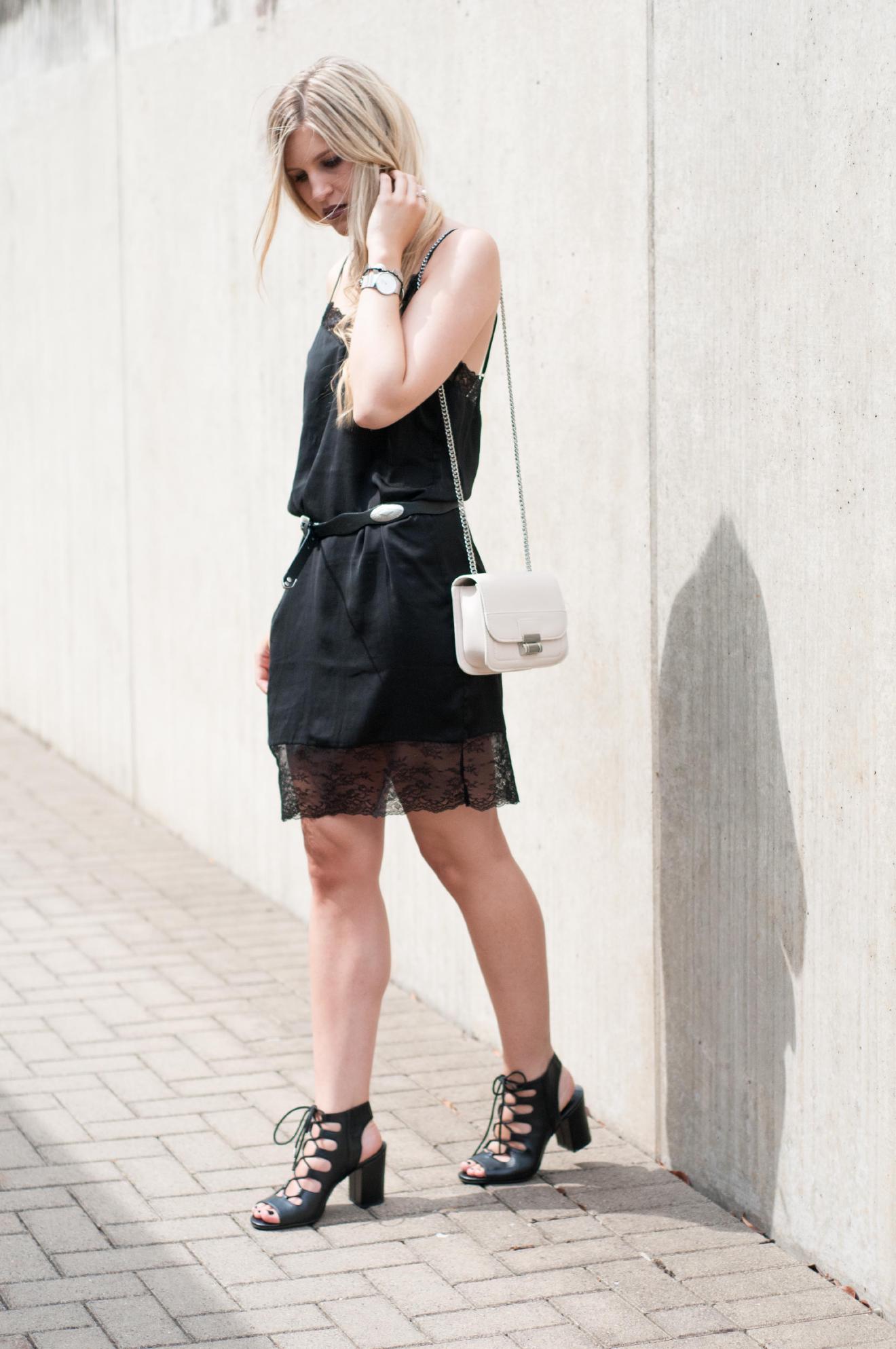 Von wegen “wie aus dem Bett gefallen”. Dieses schwarze, schimmernde Seidenkleid mit Spitze getragen mit einem markanten Gürtel machen den Pyjama-Look alltagstauglich. In Kombination mit hohen lace-up Sandalen (wie auf den Bildern gezeigt) wirkt das Outfit elegant und ist ideal für laue Sommerabende. Genauso gut kann man den Look aber auch casual mit flachen Gladiatorsandeln tragen.
