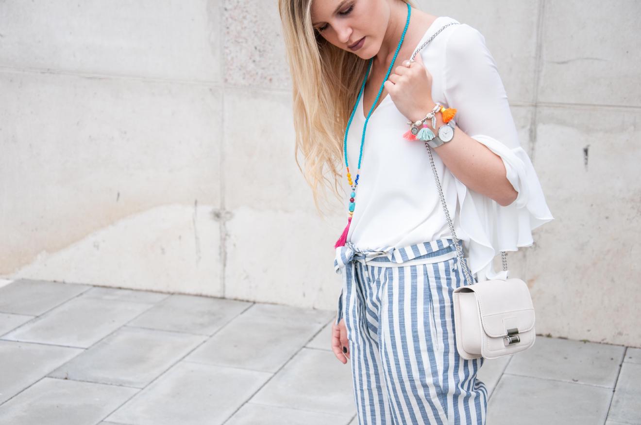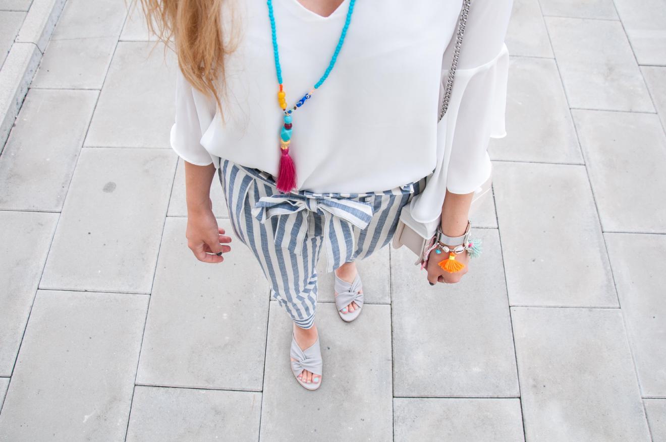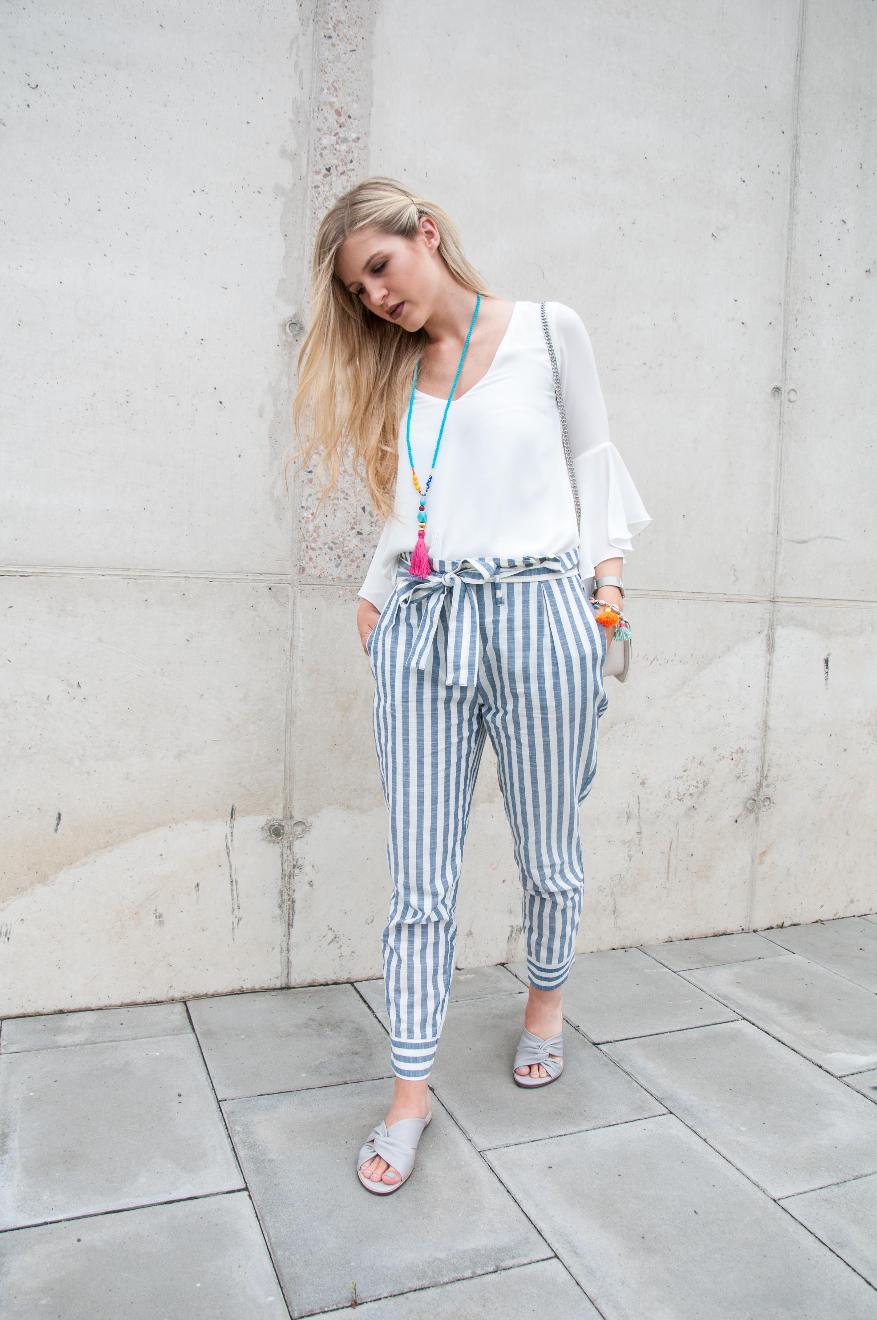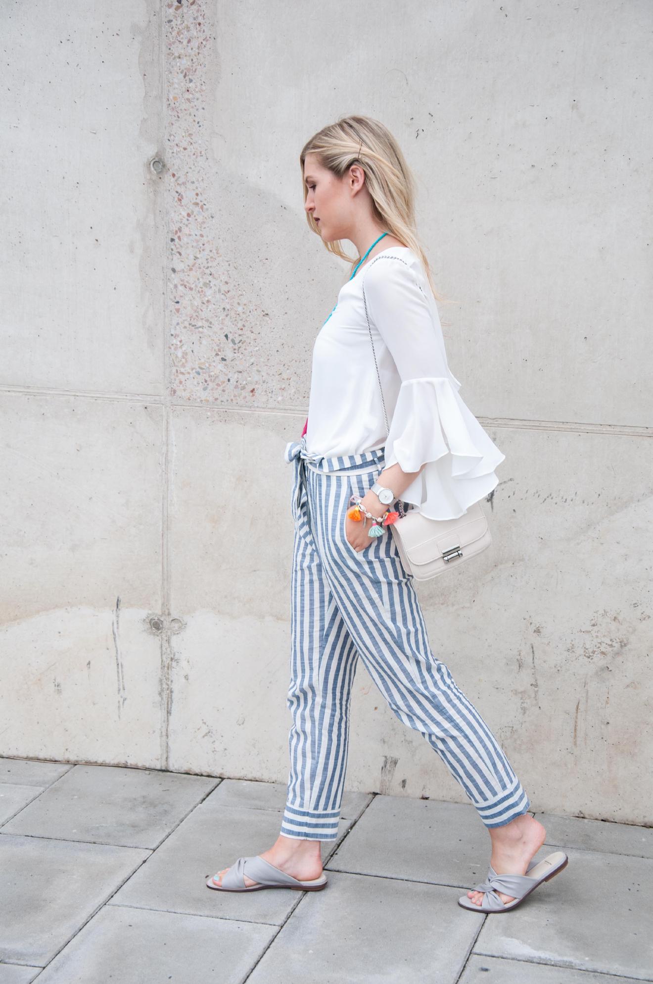 Es ist gar nicht so einfach, ein Sommeroutfit zu finden, in dem man bequem unterwegs ist und gleichzeitig schick, aber nicht langweilig aussieht. Zur gestreiften High-waist Slacks style ich meine weiße Bluse (dank den Glockenärmeln ein raffiniertes Trendteil). Damit der Look cool und lässiger wirkt kombiniere ich meine grauen Schlappen dazu. Das Besondere daran ist die verdrehte Optik, die einer Schleife gleicht. Mal was anderes und gefunden im Sale! Ähnliche Modelle gibt es von Topshop oder mit größerem Geldbeutel bei Gucci.