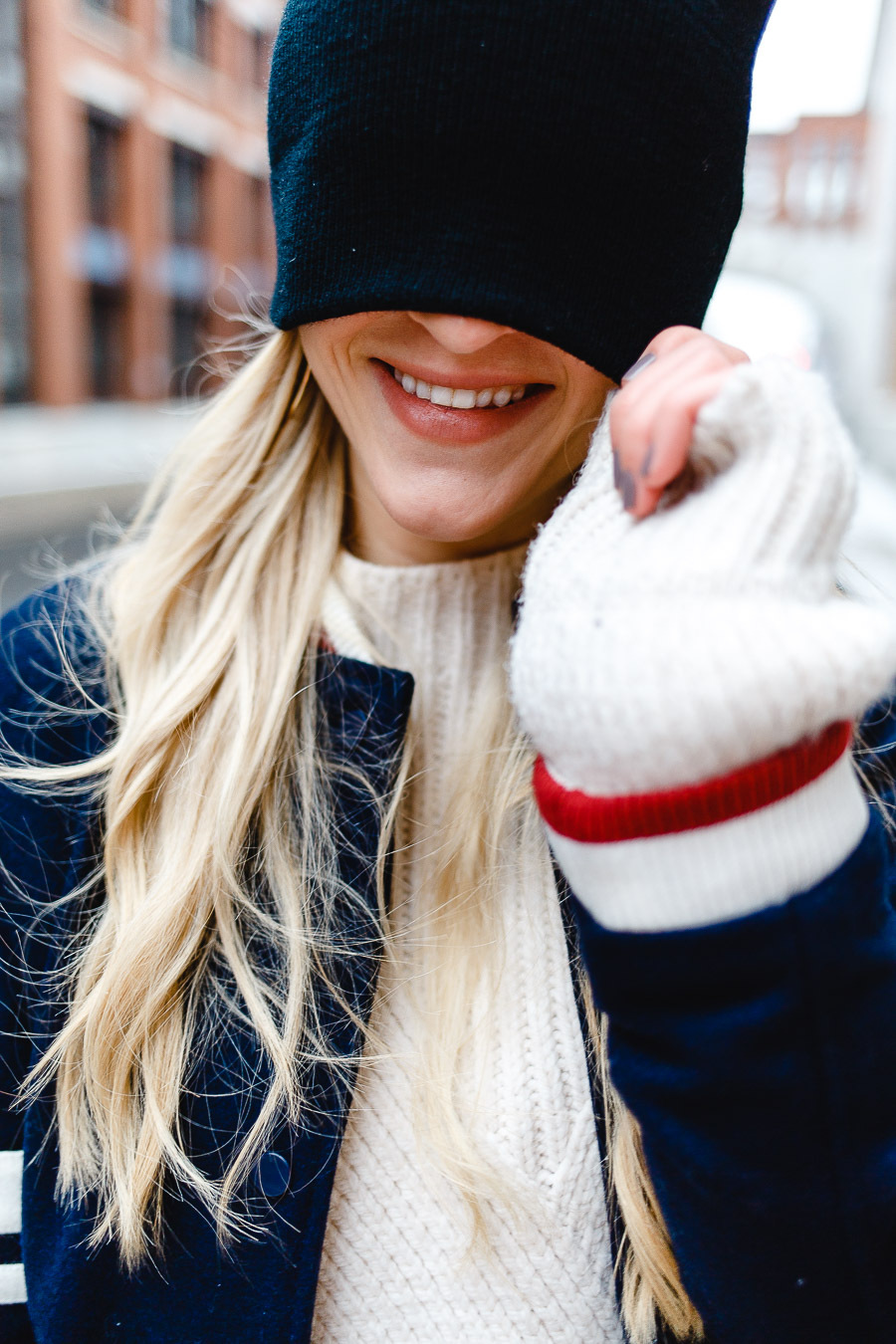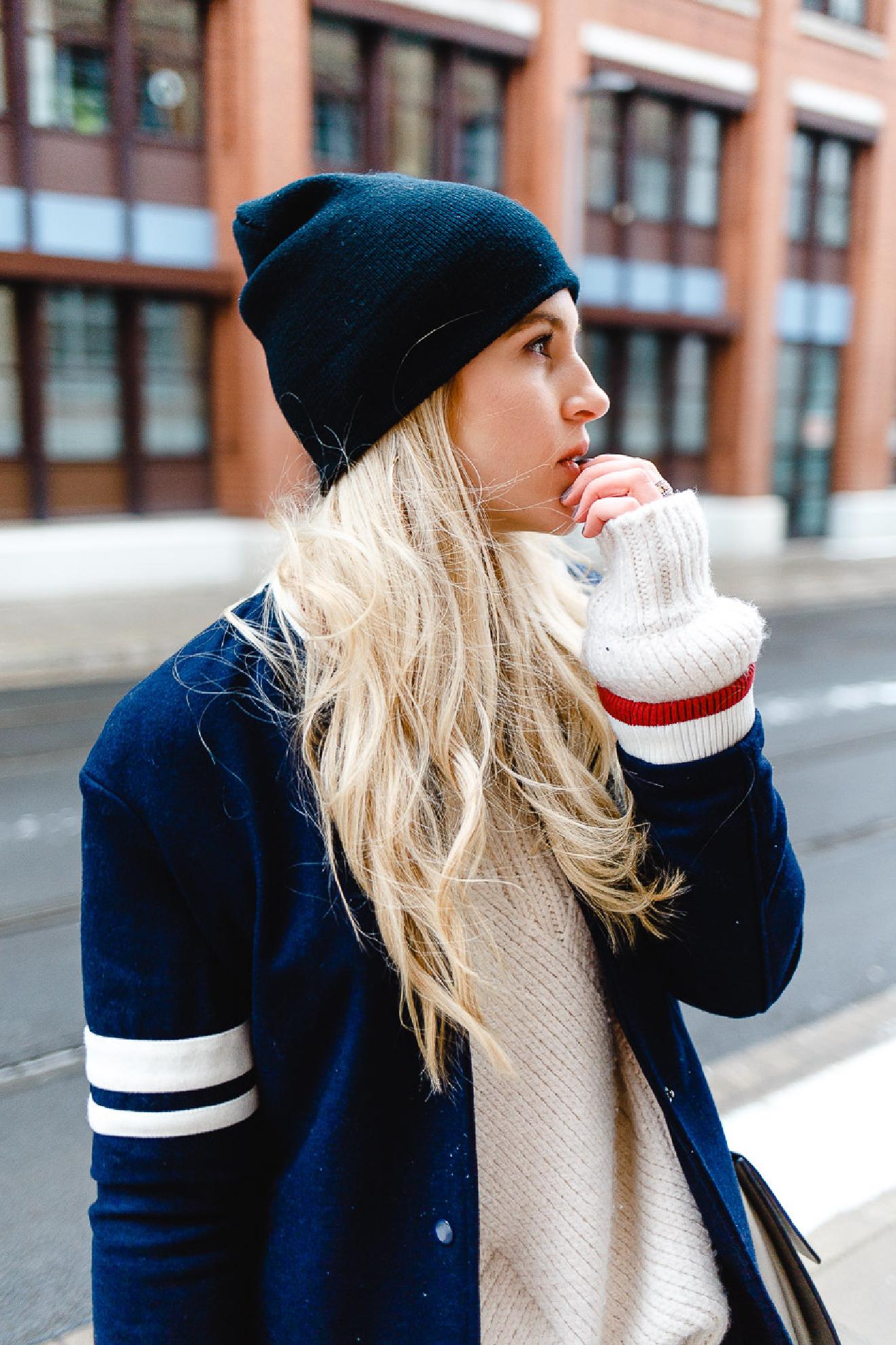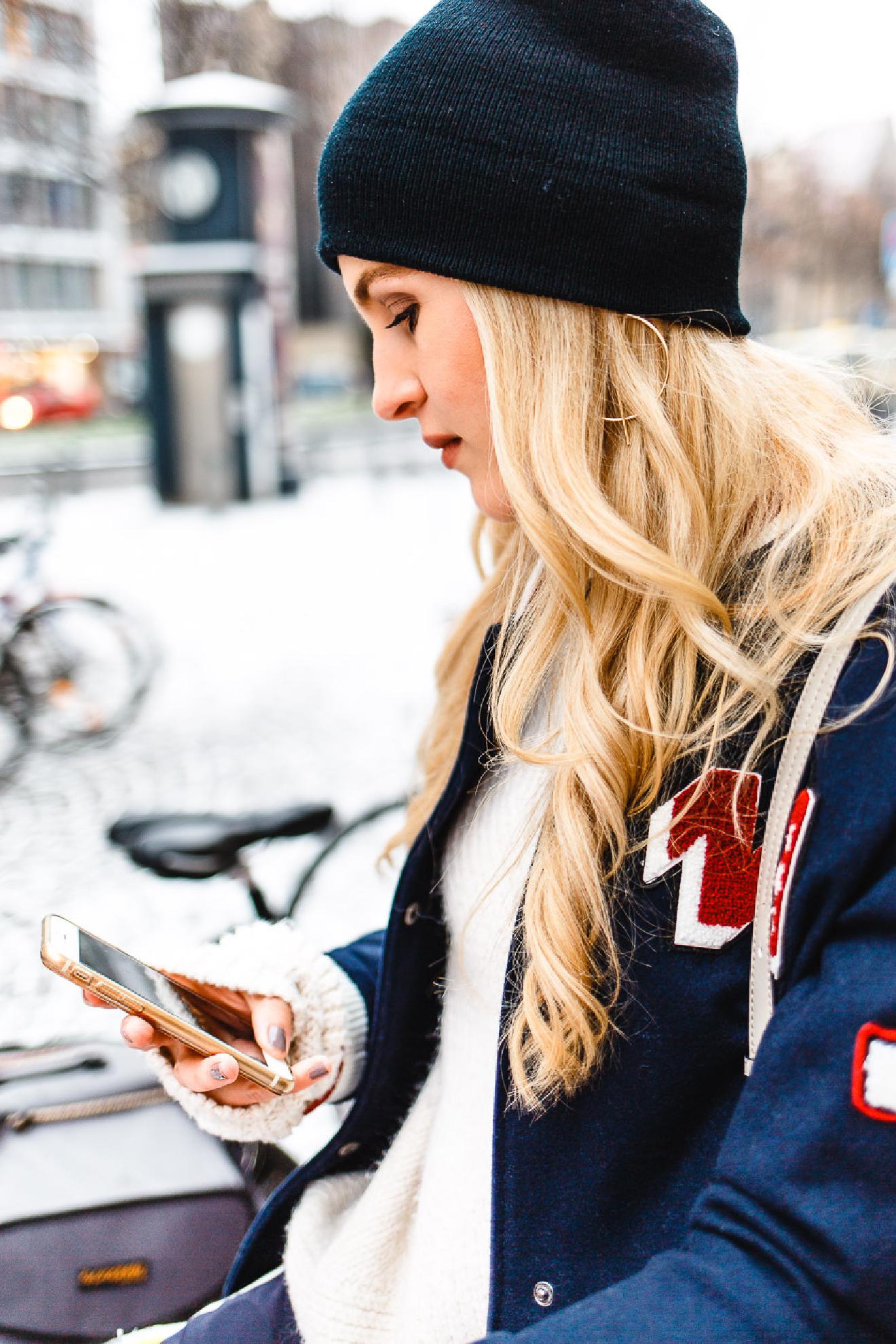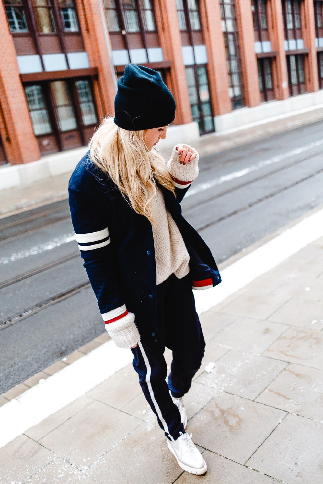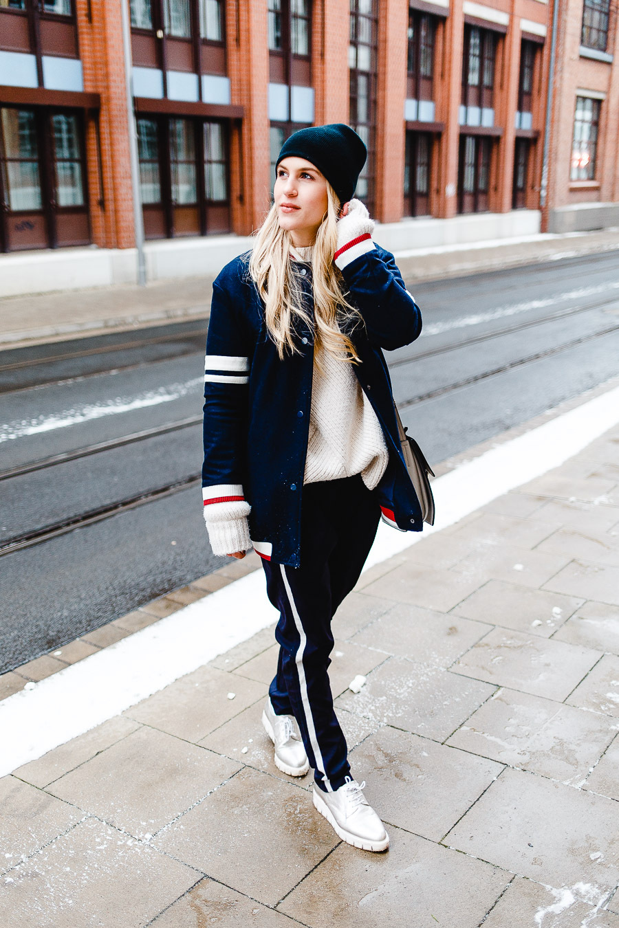 Die Key Piece Hose, mit seitlichem Streifen, ist mein liebster Jeans-Ersatz! Aus fließendem Webstoff ist sie super bequem und durch den weißen Streifen absolut angesagt. Ich trage sie in Kombination mit einer College Jacke, einem Oversize-Pullover, Beanie und silbernen Plateauschuhen. Der kuschelige, weiße Oversize-Pullover und die „ehemals“ weißen Plateausohlen 😉 greifen das Weiß des Streifens wieder auf! Wie man merkt, gehe ich nicht sonderlich pfleglich mit meinen Schuhen um. Aber meiner Meinung nach sind Schuhe Gebrauchsgüter. Sehr zum Ärger meines Freundes, der penibel auf seine Schuhe achtet 😀 So zurück zum Thema.. mit dieser Hose von 2ndone, bestellt über MyOnbelle, macht Ihr nichts falsch! Nach Lust und Laune könnt Ihr die Hose mit einer Bluse oder einem Rollkragenpullover tragen und das Outfit ist sofort bürotauglich. Oder Ihr kombiniert ein T-Shirt und Sneakers für den Freizeitlook. Diese Flexibilität überzeugt mich definitiv und ich hoffe Euch auch?!