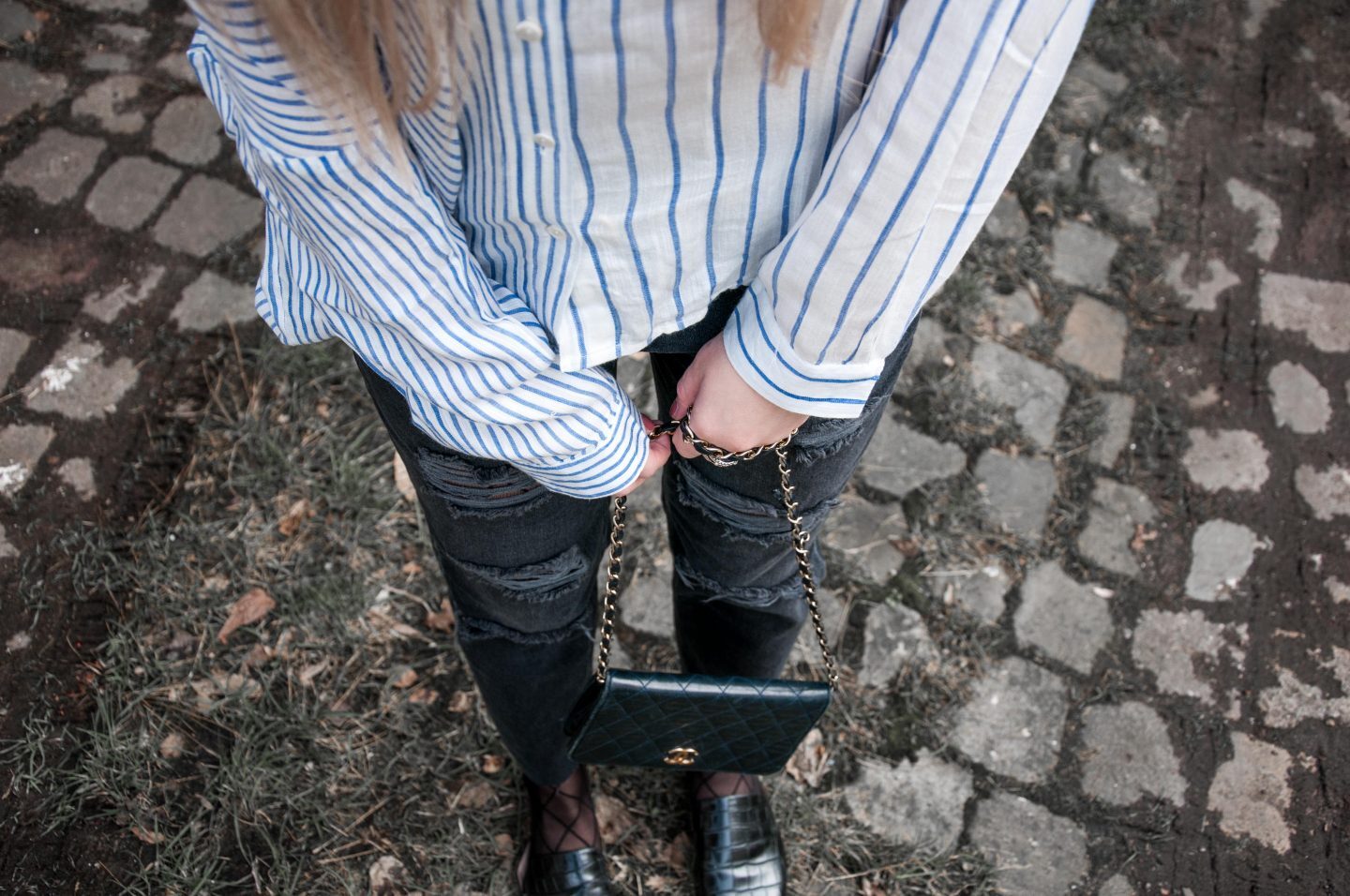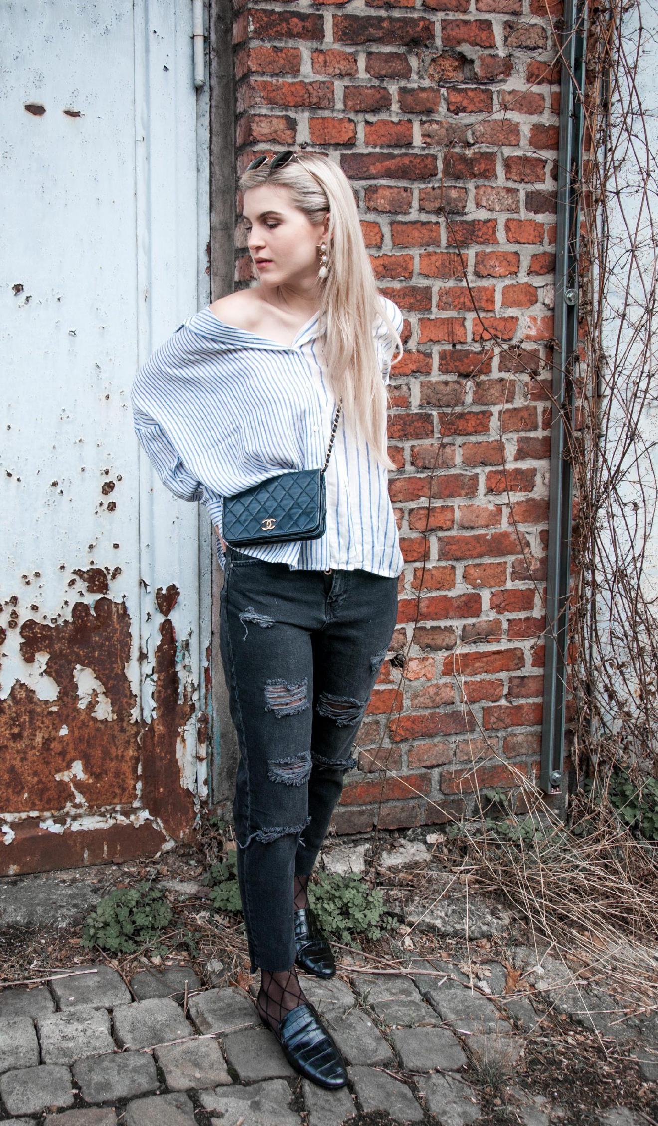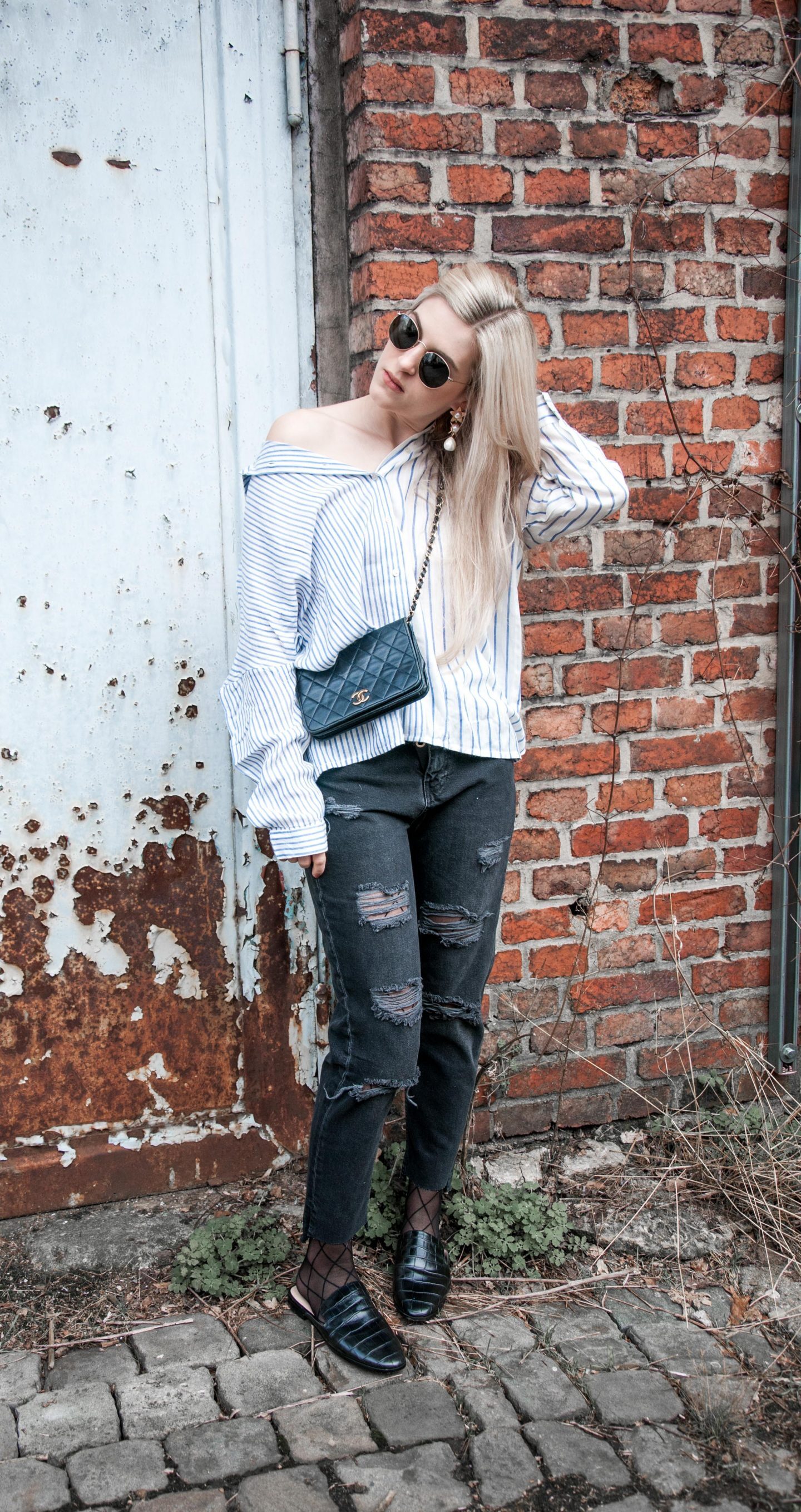 Streifen bleiben uns auch im Frühjahr erhalten – besonders schön in zarten Blautönen und unterschiedlichen Streifenbreiten. Wer noch stylischer unterwegs sein möchte, für den gibt es Streifenblusen gepatcht mit Punktemustern. Wichtig an der neuen Streifenthematik ist der Schnitt. Meine Bluse ist übergroß geschnitten und lässt sich lässig über eine Schulter tragen. Dazu kombiniere ich eine destroyed Boyfriend Jeans und Slipper.