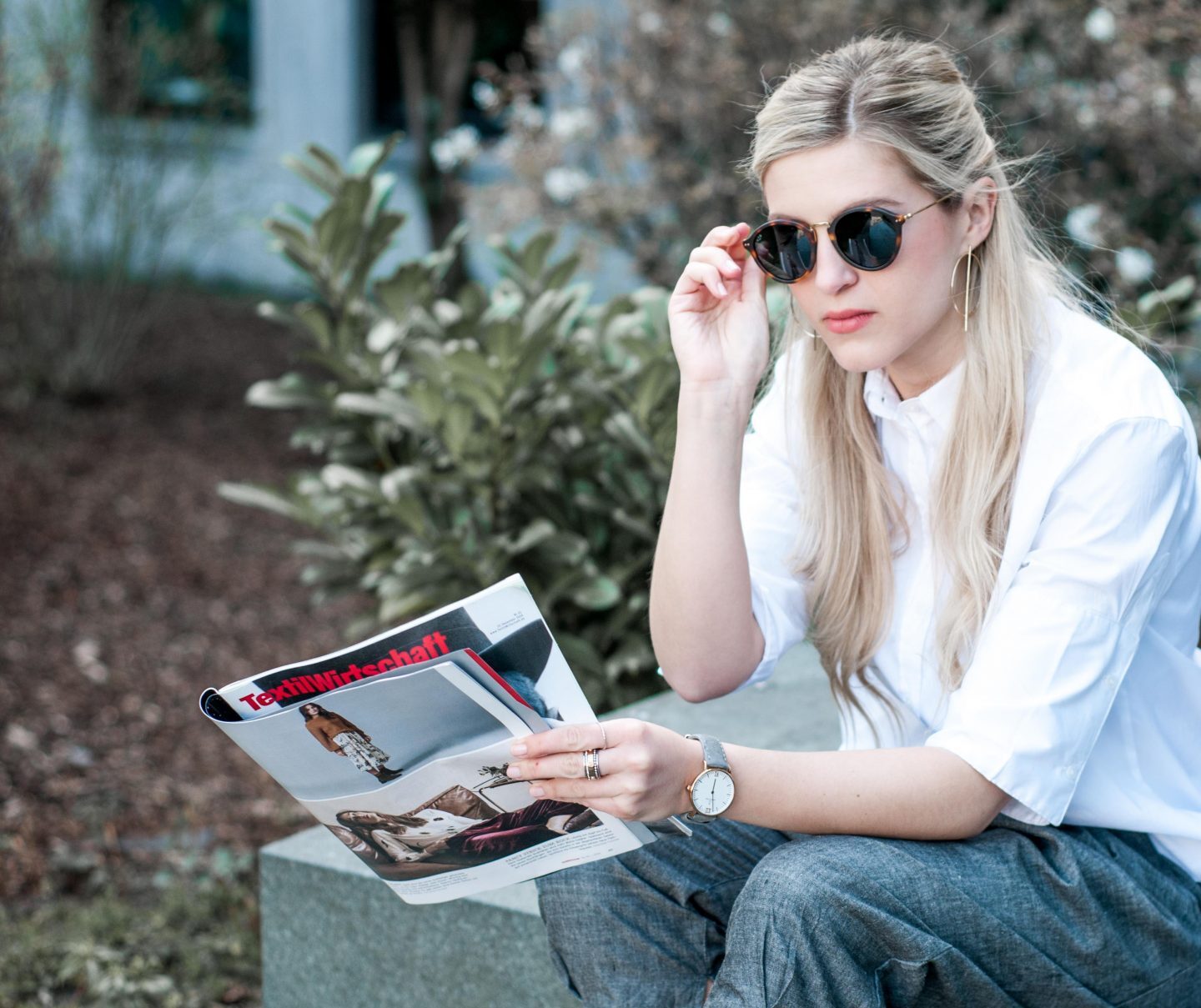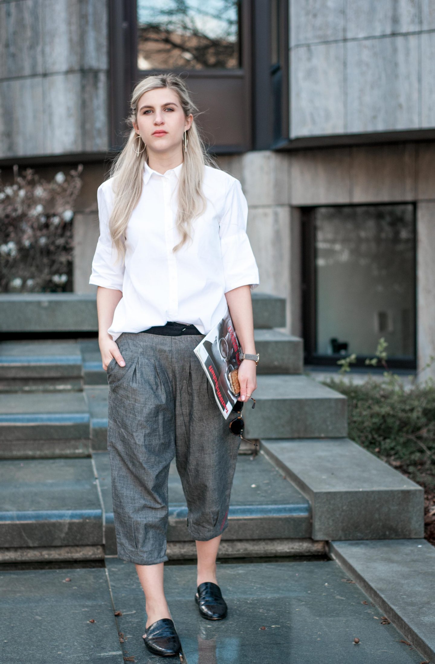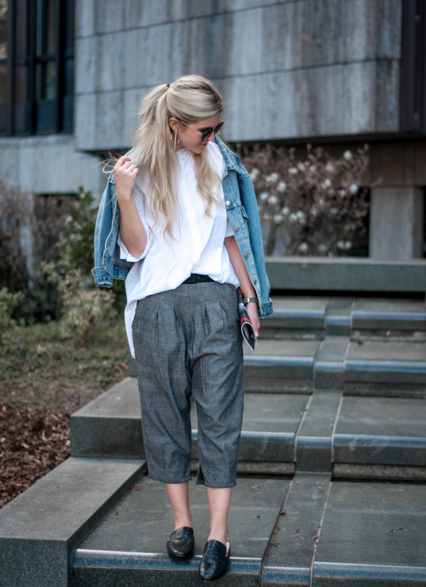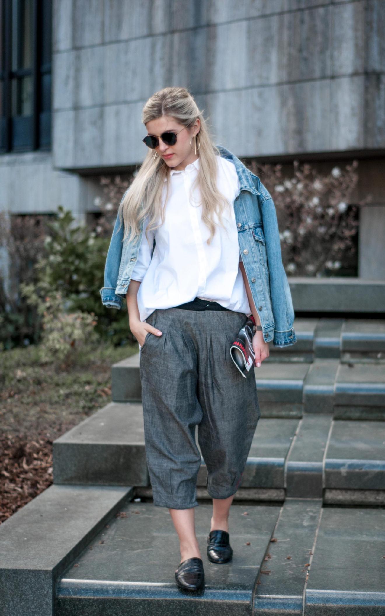 Ein absolutes Retro-Statement ist meine Levis Jeansjacke – bestellt über Crämer & CO. Die perfekte Waschung, der perfekte Schnitt… was soll ich sagen? Ich bin verliebt in diese Jacke! Sie lässt sich easy zu einem Shirt und Skinny-Jeans, feminin zu einem zarten Spitzenkleid oder schick zu einer Long-Bluse und Haremshose tragen. Ja Ihr habt richtig gelesen – die Haremshose ist zurück. Was vor ein paar Jahren noch ein Mitbringsel aus dem Türkei-Urlaub war, hat sich in den letzten Jahren zu einer stylischen Sommerhose etabliert. Die klassische Haremshose ist in der Taille eng, im Schritt weit geschnitten und wadenlang. In der Regel ist sie aus weichem fließenden Stoff, der locker fällt. Die Hose von Matterprint dagegen ist aus einer mittelschwere Chambray Ware und kann Unisex getragen werden. Dadurch lässt sie sich auch mit einer Bluse und Flats elegant kombinieren und ist bürotauglich und noch dazu unglaublich bequem. Klassische Business-Outfits gibt es wie Sand am Meer. Daher wollte ich Euch meinen individuellen Business-Look zeigen und bin gespannt, ob er Euch gefällt.