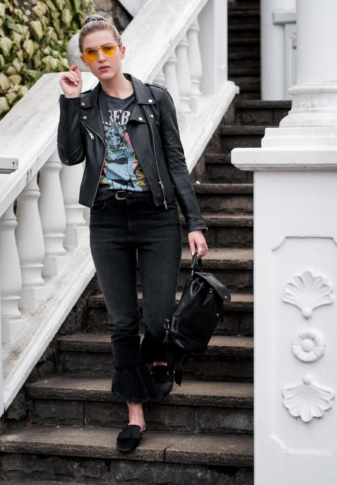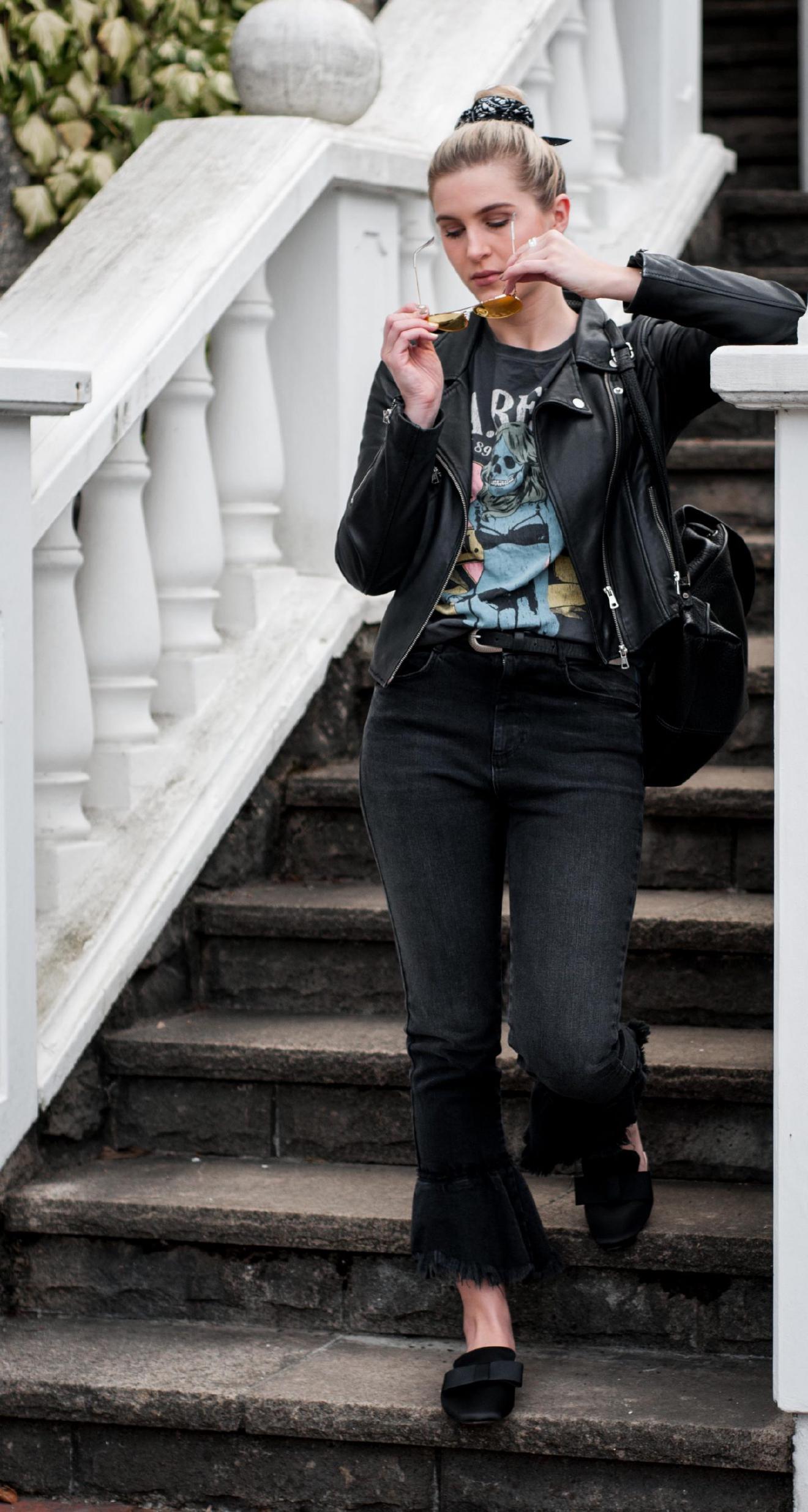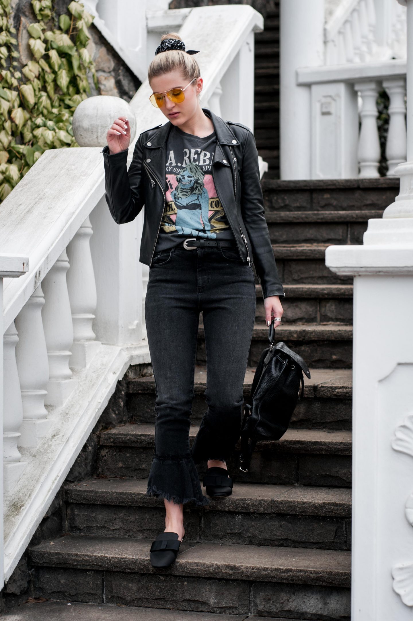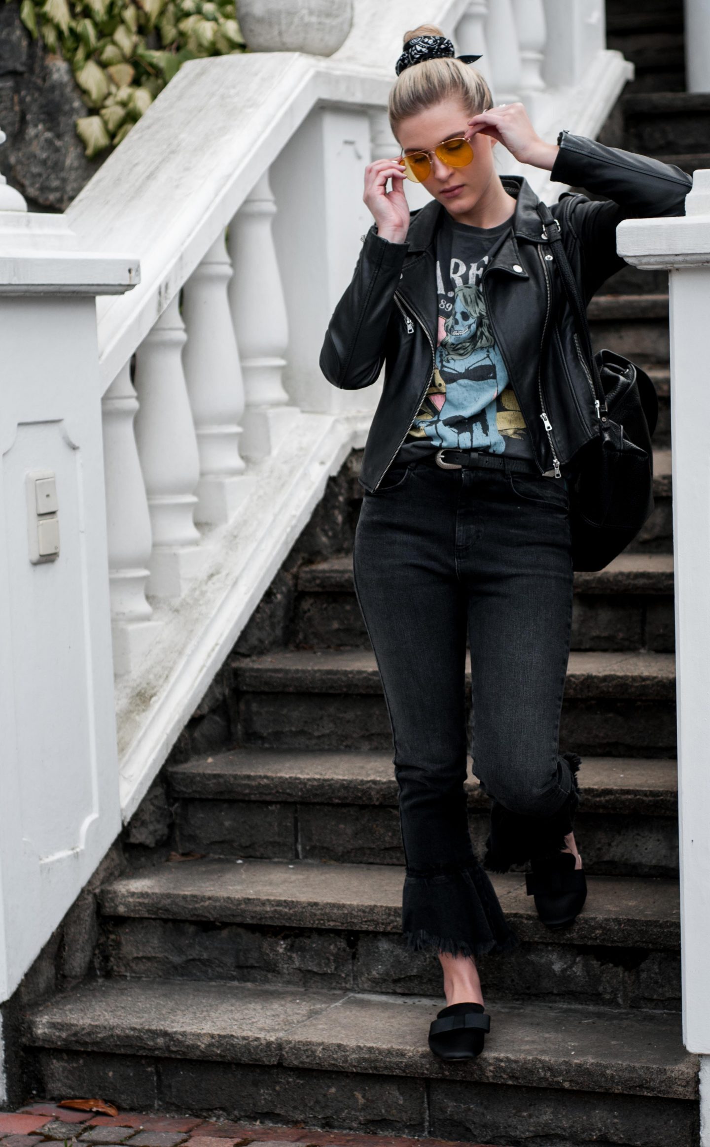 Boyfriend-Style: Wie kombiniere ich den Trend richtig? Wir geben es ja zu, wir Mädels von 8 Girls – 8 Views klauen unseren Männern gerne Teile aus dem Schrank. Zum Schlafen schlüpfen wir am liebsten in sein übergroßes T-Shirt und seine Boxershirts. Ein Boyfriend-Teil kann aber viel mehr als nur gemütlich sein – Ihr könnt damit trendverdächtige Looks kreieren, das beweisen wir Euch in unserer aktuellen Blogroll. Mein Keypiece ist ein Vintage Brandshirt, das nach einem gemeinsamen Verkauf auf dem Flohmarkt in meinen Händen gelandet ist. Zum lockeren T-Shirt eine Skinny-Jeans – für mich die perfekte Wahl. Wer das Outfit nochmal aufpeppen möchte, setzt auf eine auffällige Jeans, wie z.B. meine mit Volant Saum. Um den rockigen Charakter des Shirts zu unterstreichen, trage ich meine schwarze Lederjacke und ein Bandana im Haar. Durch meine farbige Sonnenbrille wirkt der Look nicht zu düster. Fehlen noch die passenden Schuhe: Meine Wahl fällt auf meine absoluten Lieblingstreter – Schlappen.
