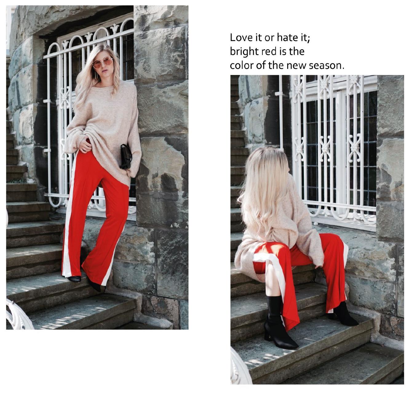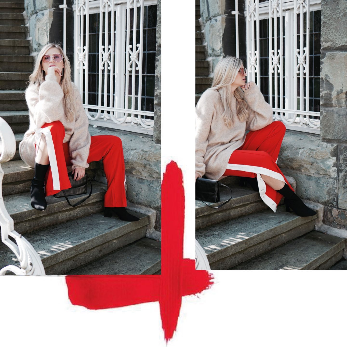 Für meinen alltagstauglichen Red-Look reicht ein rotes Teil völlig aus. Dabei setze ich auf eine Athleisure-Hose mit Galonstreifen. Dazu kombiniere ich einen Oversized-Pullover in Camel und meine liebsten Sock-Boots. Durch die verschiedenen Stoffe ist das Outfit ein spannender Mix aus elegant und sportlich.