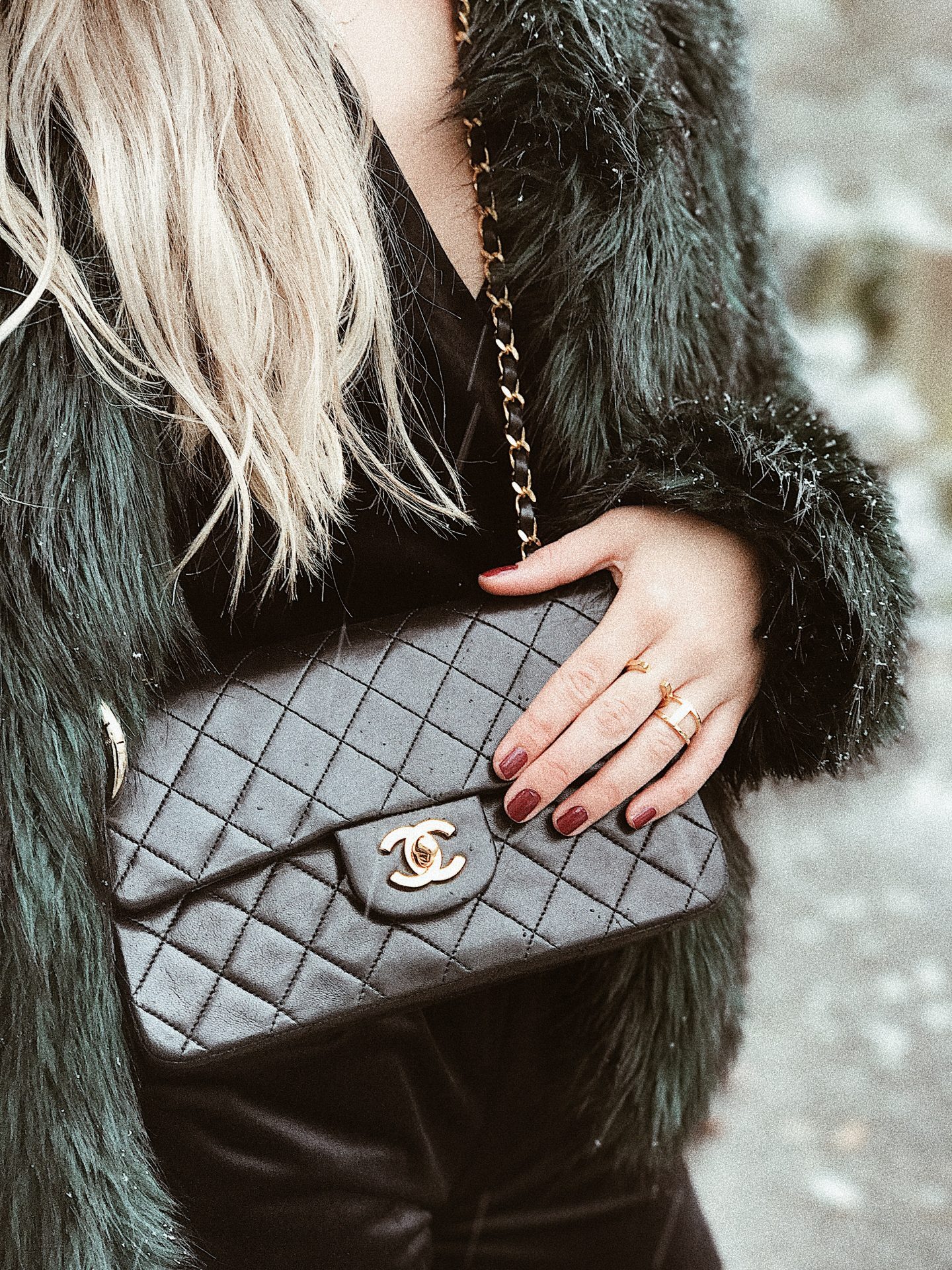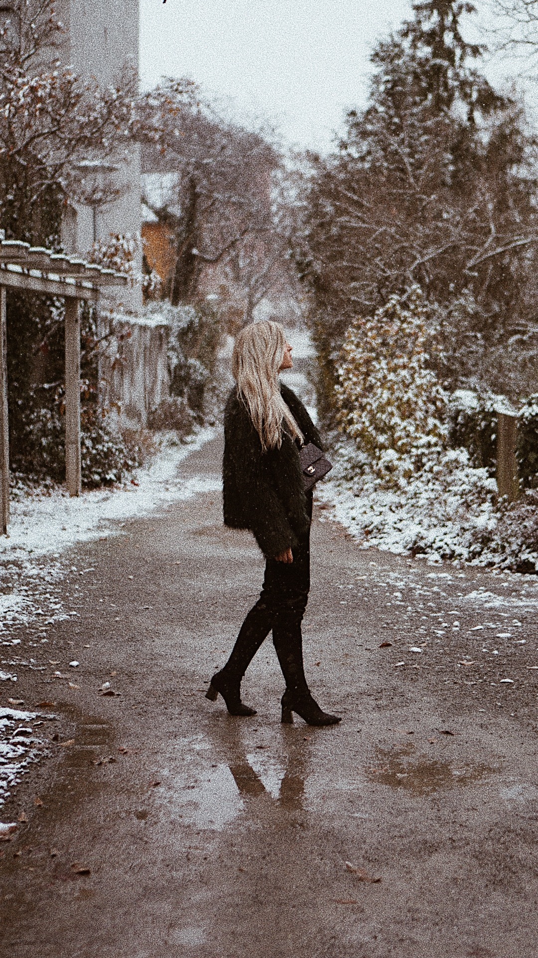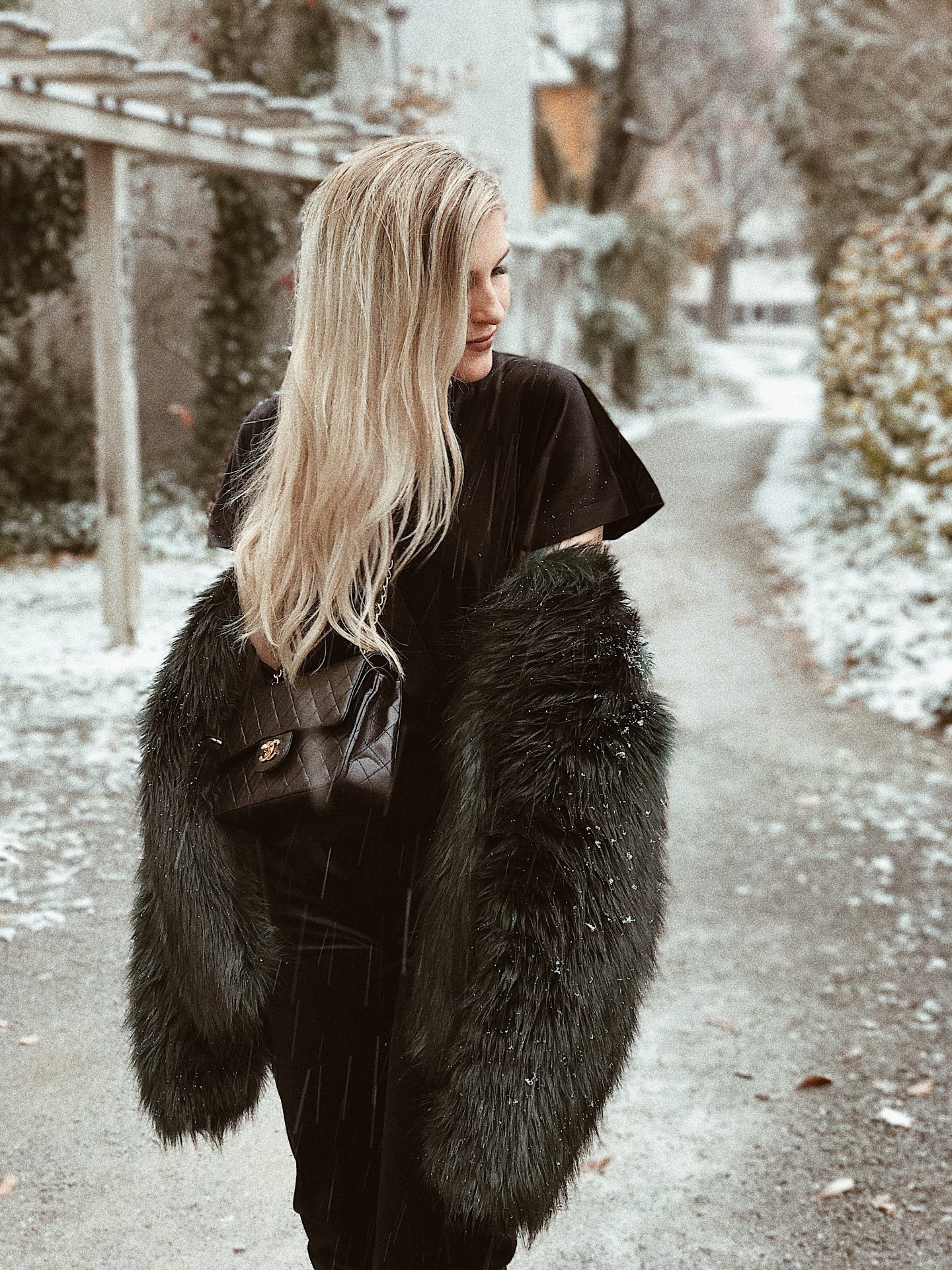 Samt, Samt, Samt von Kopf bis Fuß bitte in diesem comfy Jumpsuit. Der weiche und zugleich glänzende Stoff ist ein altbewährter Klassiker unter den festlichen Styles. Neu wirkt er in Kombination mit einer Felljacke in Smaragd und Sock-Boots. Der große Vorteil: Der Jumpsuit kaschiert gekonnt die Weihnachtspfunde und passt auch noch nach einem Festtagsmenü. Hand aufs Herz: Wer möchte auf die Völlerei an Weihnachten verzichten für ein hautenges Kleid? Niemand!