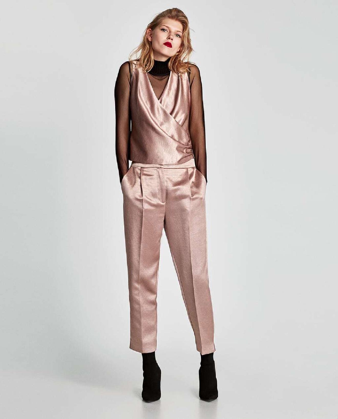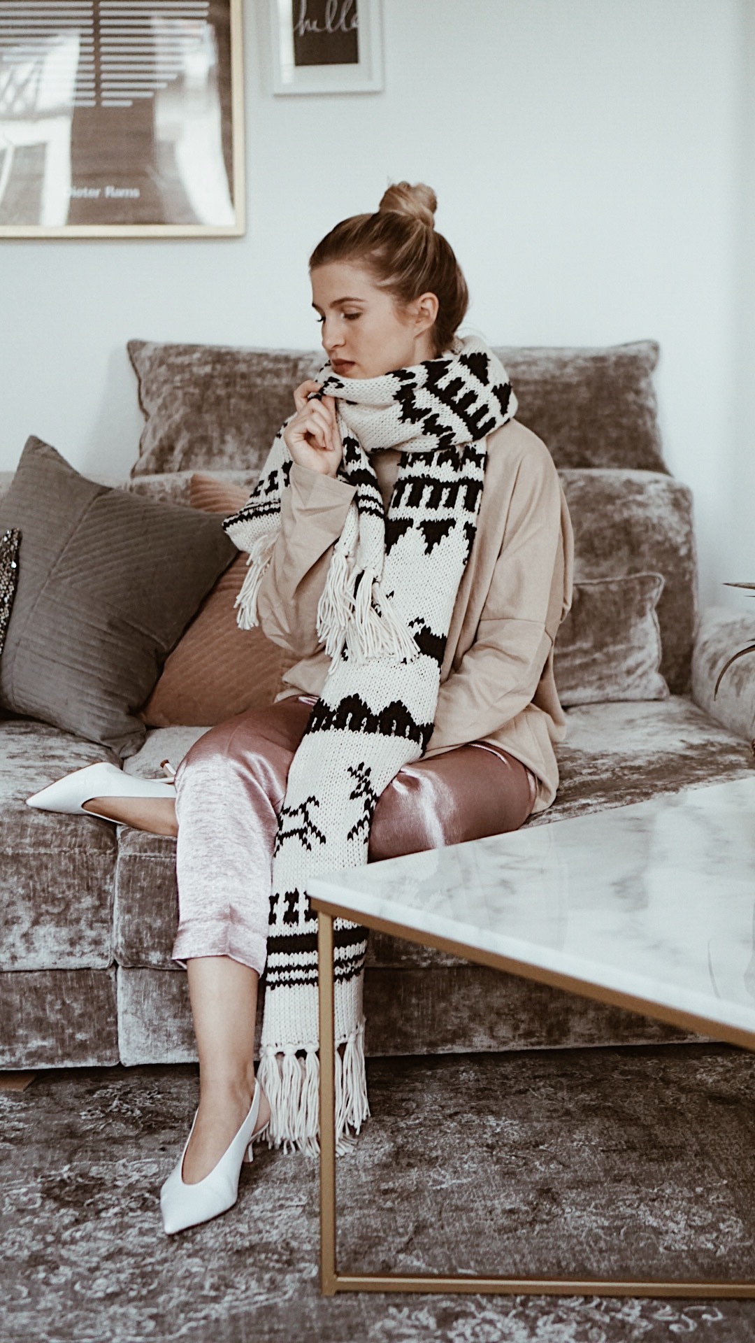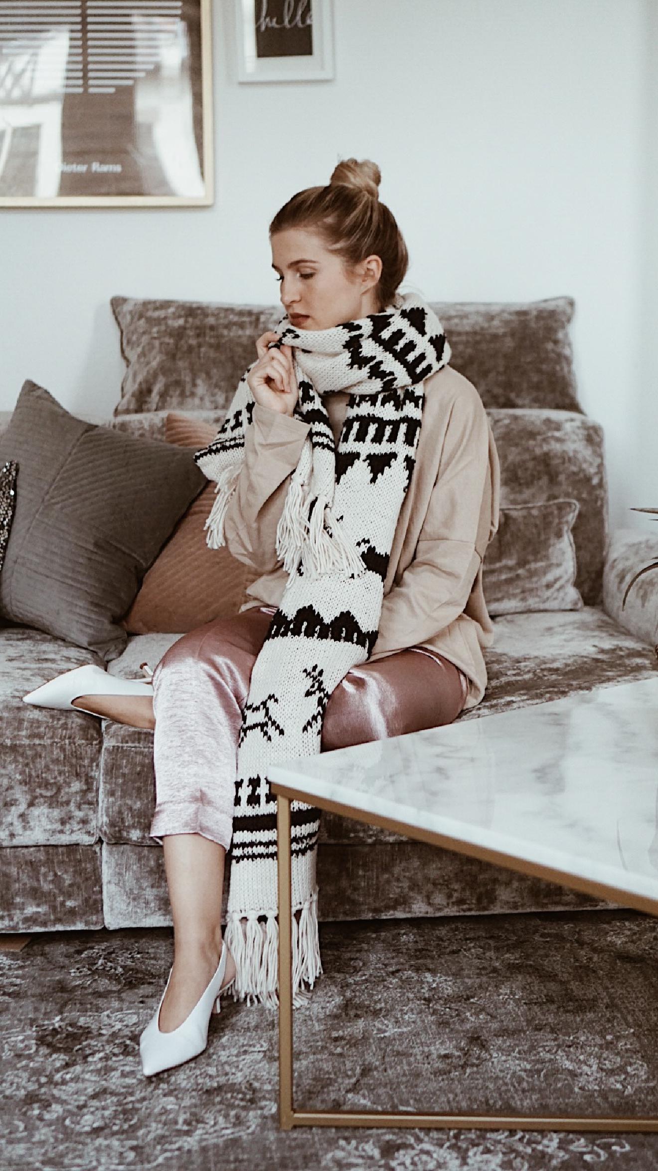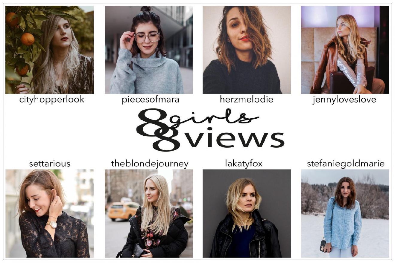 Solltet Ihr es mal nicht schaffen Euch vor der Party noch Zuhause umzuziehen, dann zeigen wir Euch diese Woche in unserer Blogroll 8 Girls – 8 Views wie Ihr trotzdem passend angezogen seid. Wichtig ist, dass Ihr ein Outfit wählt, was im Handumdrehen zum coolen Party-Style umfunktioniert werden kann. Meine schimmernde Slacks von Zara ist ein absoluter Allrounder. Sie passt zu den unterschiedlichsten Anlässen und macht auch im Büro eine super Figur. Die Hose ist nicht nur bequem, sondern zaubert auch eine schöne Figur. Der verkürzte Schnitt lässt den Blick auf die Knöchel frei und streckt das Bein. Wer möchte trägt am Tag bequeme Sneakers und am Abend Pumps oder High Heels. Dazu kombiniere ich ein Oversize-Sweat und Schal und darunter ein Top mit Spitzeneinsatz. Wer es ausgefallener mag, stylt einen transparenten schwarzen Turtleneck unter der passenden Bluse zur Hose.