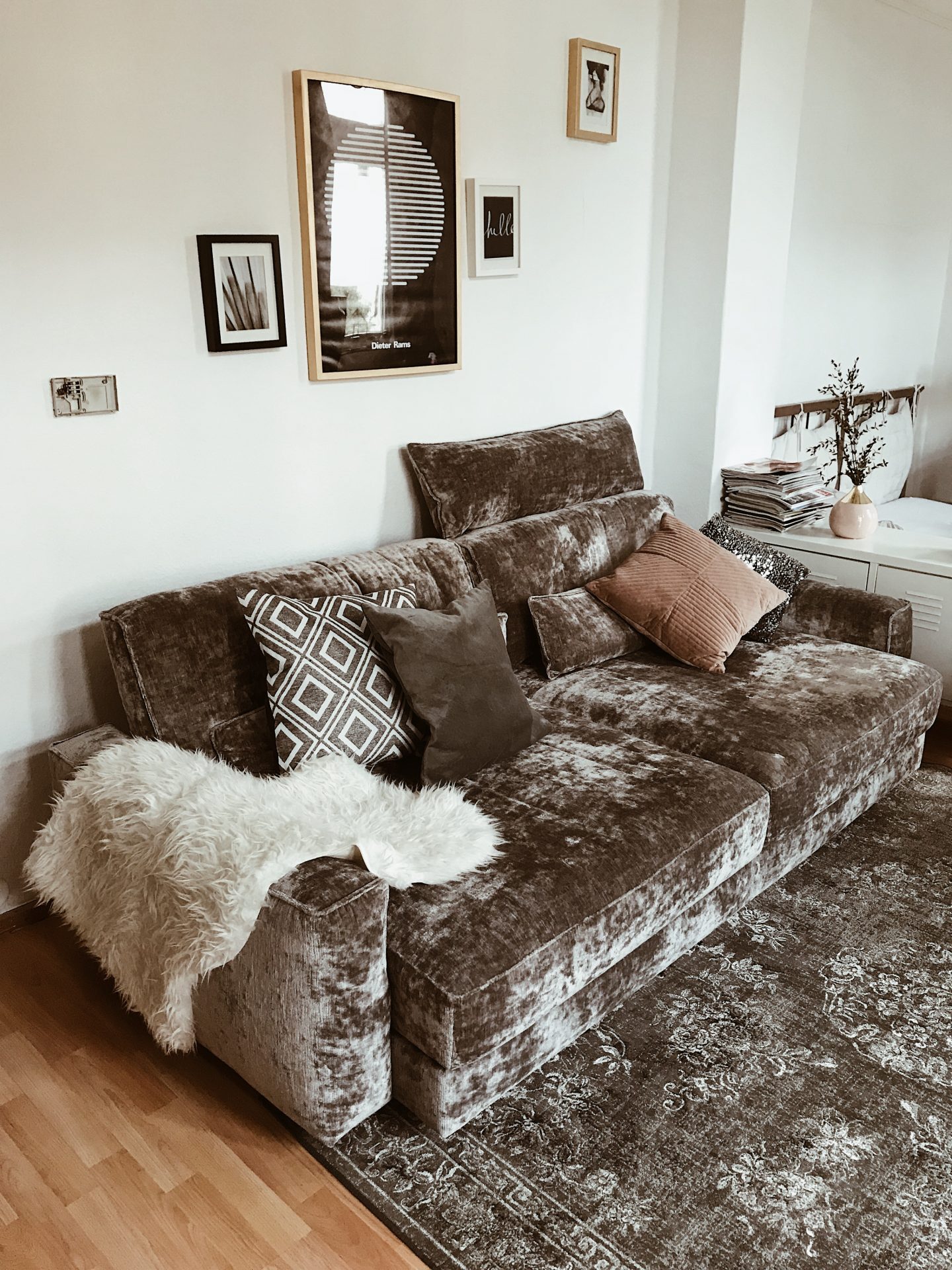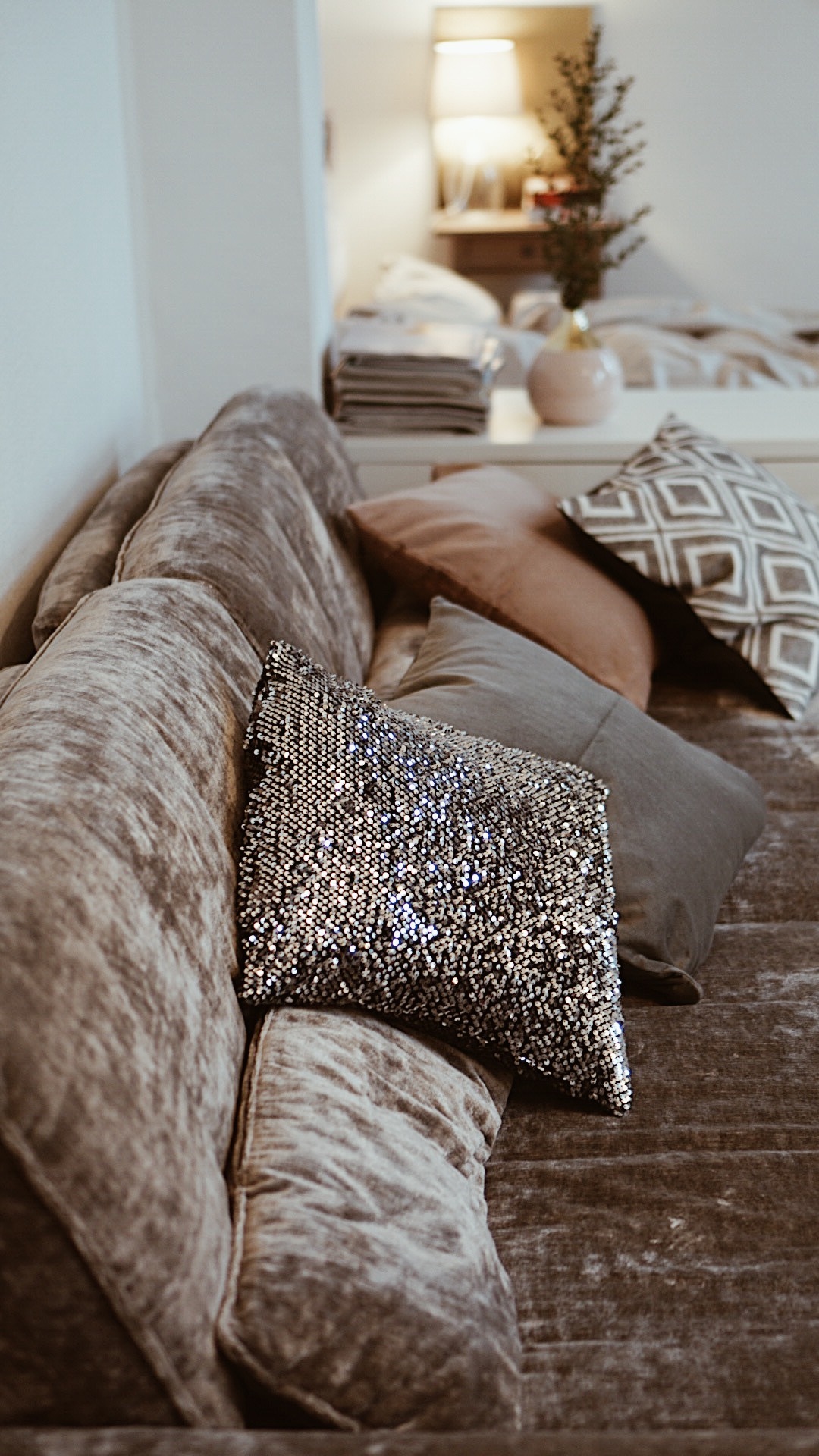 Das wichtigste Utensil im Wohnzimmer ist das Sofa, dass sowohl mit Optik als auch Komfort glänzen sollte. Letzteres bringen die neuen Sofas mit Sitztiefen-Verstellung mit. Bei meiner wunderschönen „Malea“ Samtcouch von Ewald Schillig Brand kann die Rückenlehne manuell nach vorne geschoben werden, um aus einer Liegeposition eine aufrechte Sitzposition zu machen. Auch die Kopfteile können versetzt oder weggelassen werden. Neben den technischen Highlights sind bei Sofas Materialien wie Samt, Kord und Leder in Industrie Optik besonders angesagt.