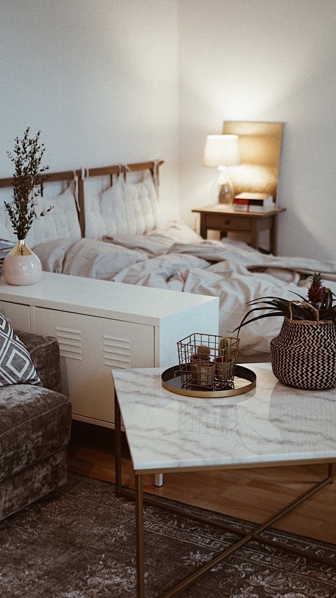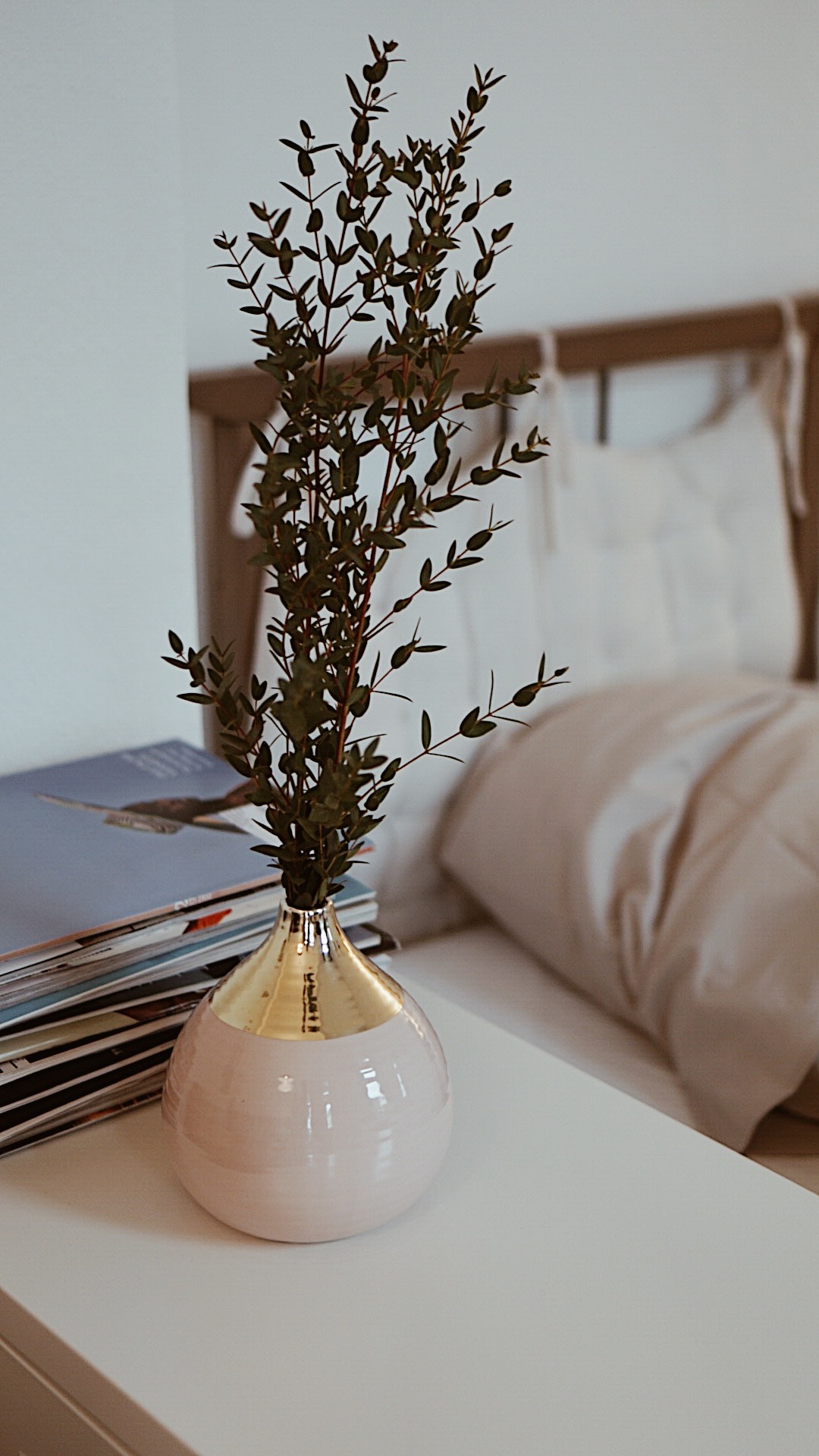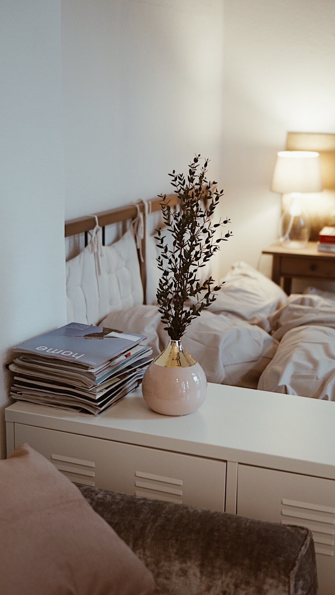Besonders angesagt sind zarte Abstufungen der Trendfarben Grün, Blau, Orange und Gelb. Wer den Evergreen Weiß bevorzugt, kann durch farblich abgestimmte Kissen, Vasen, und Bettwäsche in Grau und Altrosa eine Wohlfühlatmosphäre schaffen.