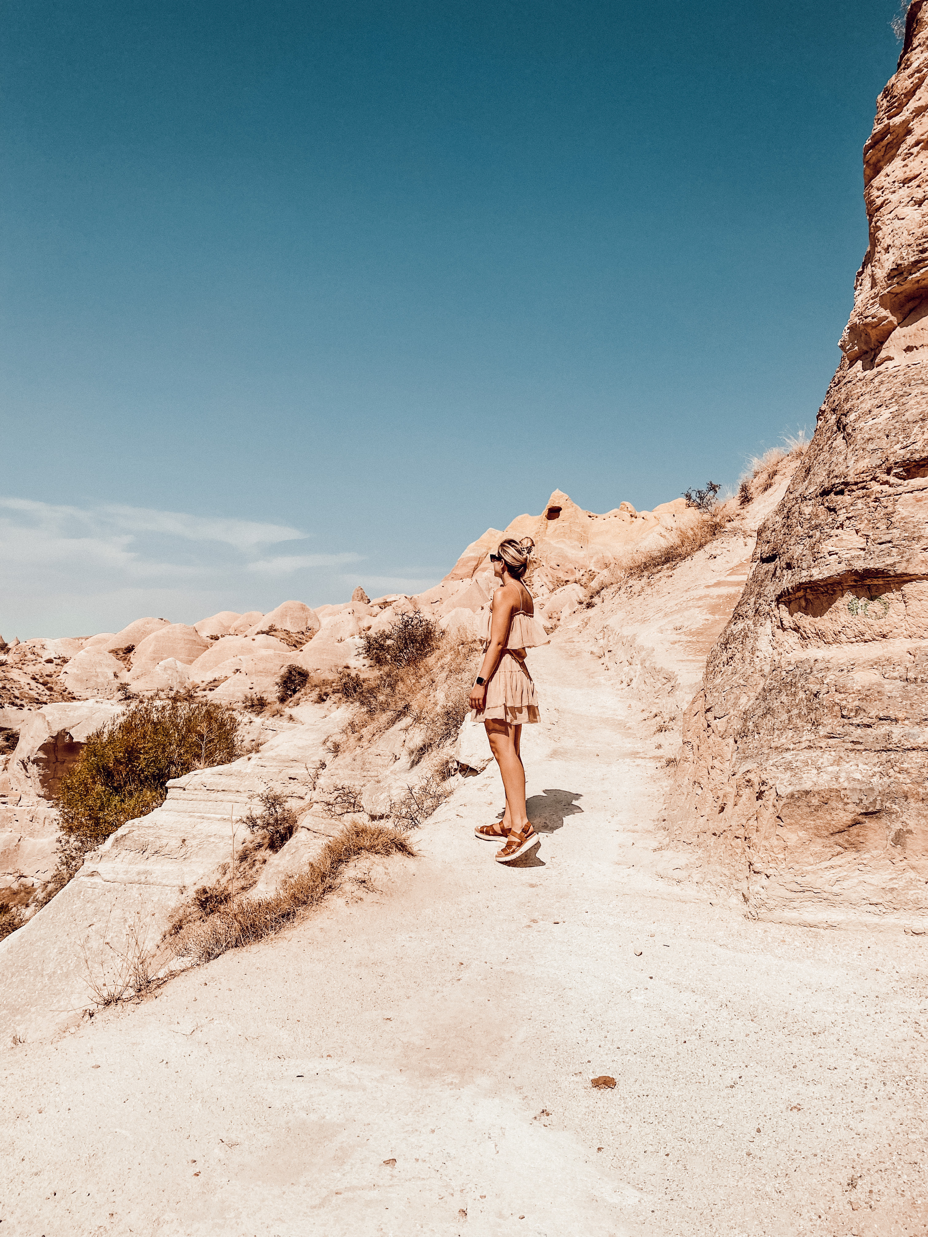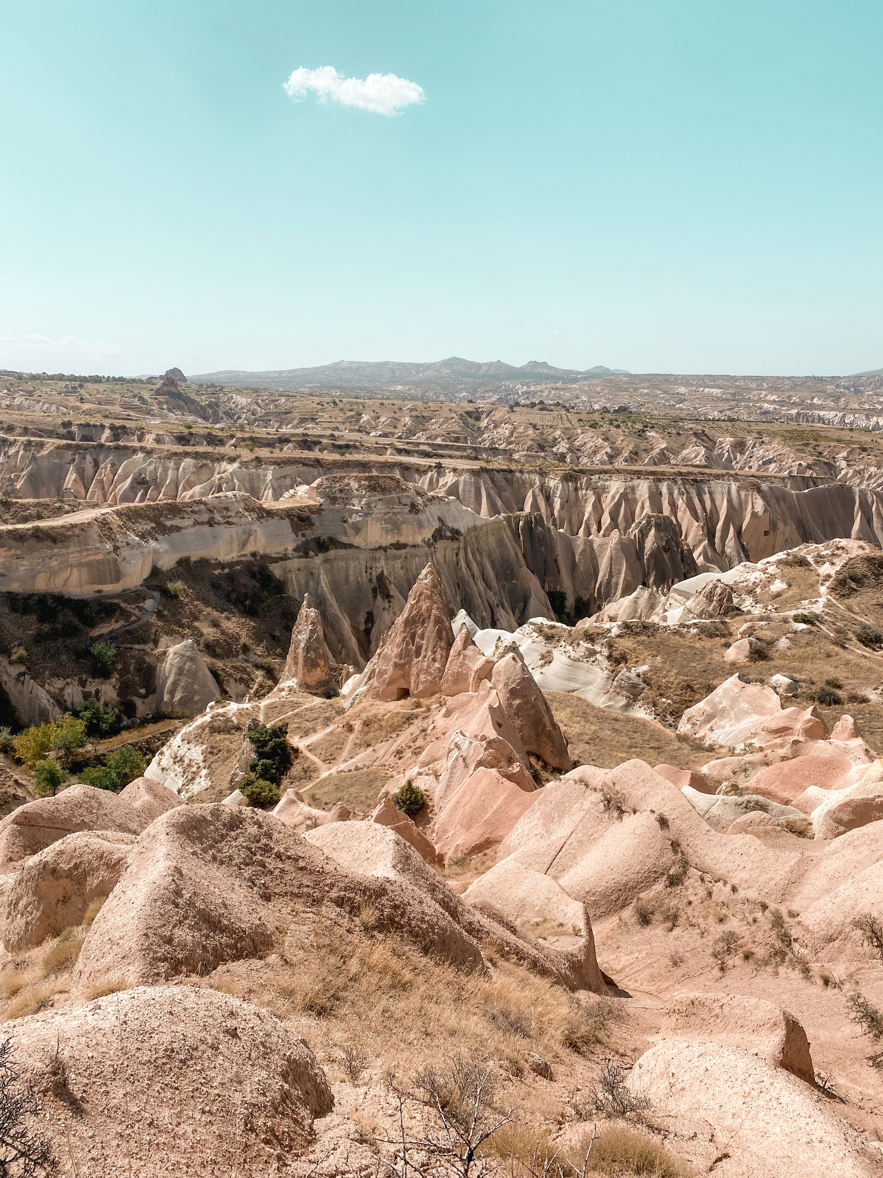 Das Rosental und die rote Schlucht in Kappadokien liegen nur 15 Fahrminuten von Göreme entfernt. Parken könnt ihr direkt beim Aussichtspunkt „Panoramic View Point“, der Euch einen einmaligen Blick über die rosaroten Felsformationen gewährt. Zum Sonnenuntergang lohnt es sich besonders herzukommen: Dann verfärbt sich das Tal rot, wie der Name Red Valley besagt. Der zweistündige Rundwanderweg hat uns vom Rose Valley in die Rote Schlucht geführt. Neben den etlichen Feenkaminen, die wir besichtigt haben, wird hier auch Wein angebaut. Der besonders süß und schwer sein soll, aufgrund der Hitze in den Sommermonaten. Selbst jetzt im September hatte es die Sonne in sich.